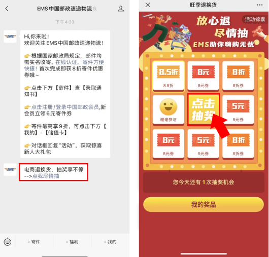 活動(dòng)期間抽獎(jiǎng)福利天天有,下單返券等你來。這個(gè)雙十一,退換貨就選郵政EMS,為快遞保駕護(hù)航的同時(shí),讓廣大消費(fèi)者享受真正實(shí)惠的運(yùn)費(fèi)折扣!