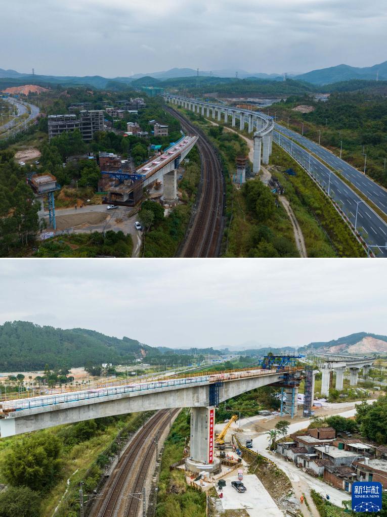拼版照片:清遠(yuǎn)磁浮旅游專(zhuān)線長(zhǎng)隆特大橋跨京廣鐵路連續(xù)梁轉(zhuǎn)體前后的對(duì)比(上圖攝于11月7日,下圖攝于11月8日,無(wú)人機(jī)照片)。