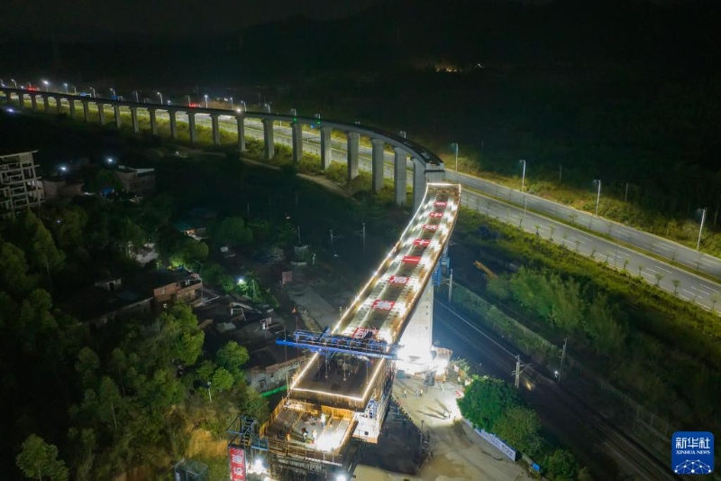 11月8日,施工人員在清遠(yuǎn)磁浮旅游專(zhuān)線長(zhǎng)隆特大橋跨京廣鐵路連續(xù)梁轉(zhuǎn)體現(xiàn)場(chǎng)作業(yè)。