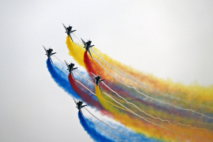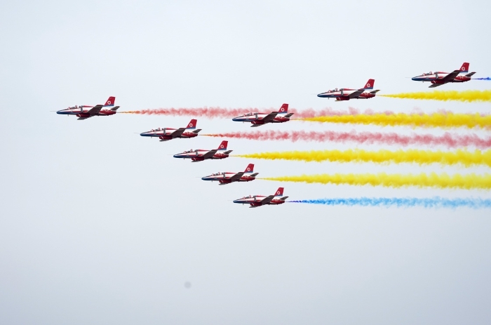 上午10時,首先進行飛行表演的是空軍八一飛行表演隊,6架殲-10呈現了大仰角躍升、六機編隊斤斗、六機同步橫滾等動作,不僅精彩震撼,同時也具備很高的實戰(zhàn)價值。作為空軍“學院派”飛行表演隊的空軍航空大學“紅鷹”飛行表演隊,以“飛出驚險、飛出極限、飛出震撼”而著稱。針對珠海的天氣與地域特點,他們今年增加了八機通場、八機盤旋等動作,表演更緊湊、更有看點。
