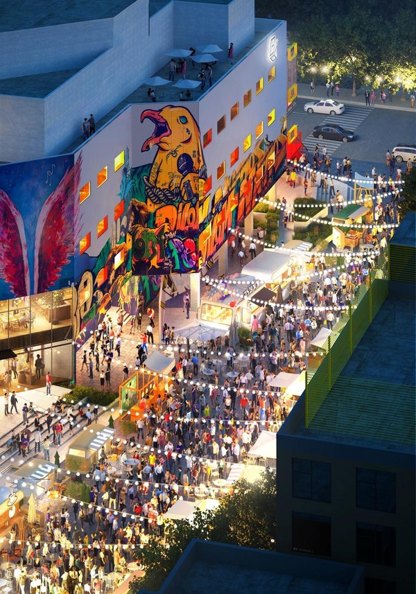從項(xiàng)目南側(cè)出發(fā),映入眼簾的是匯集多位青年藝術(shù)家作品的北京最長(zhǎng)藝術(shù)裝飾畫(huà),以城市為畫(huà)布,將潮流融入街頭,THE BOX朝外南街市集將結(jié)合音樂(lè)、集市、潮流文化,為城市年輕人打造充滿煙火氣息的周末潮圣地。