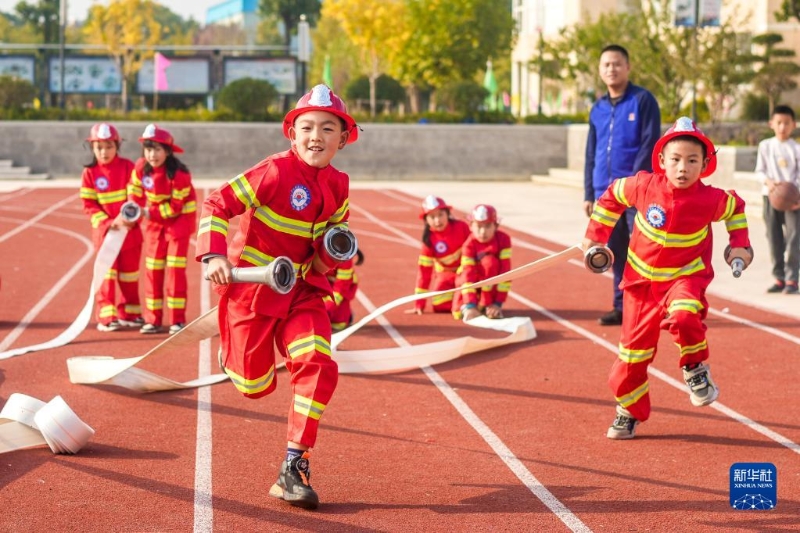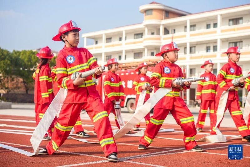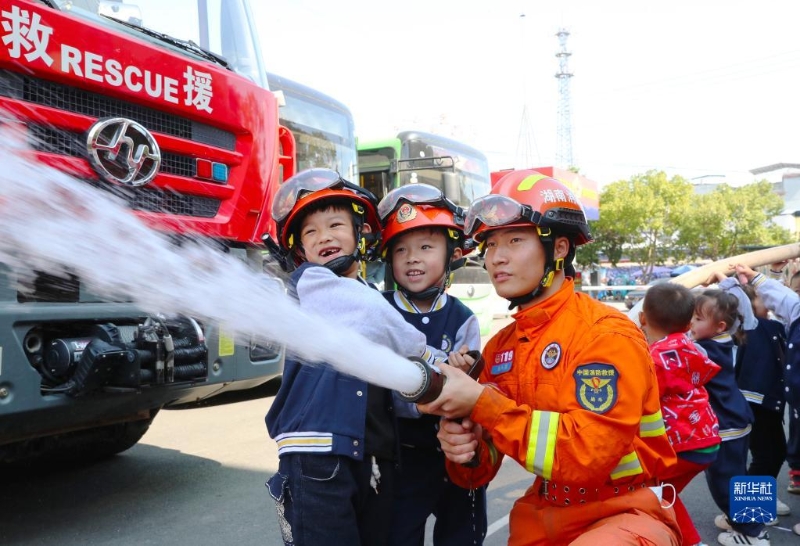 11月9日,在湖南省新田縣,小朋友在消防員的指導(dǎo)下體驗(yàn)消防水槍。