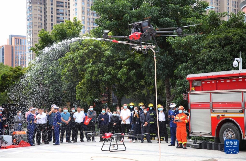 11月9日,在福建省龍巖市新羅區(qū),消防員在演示無人機(jī)滅火操作。
