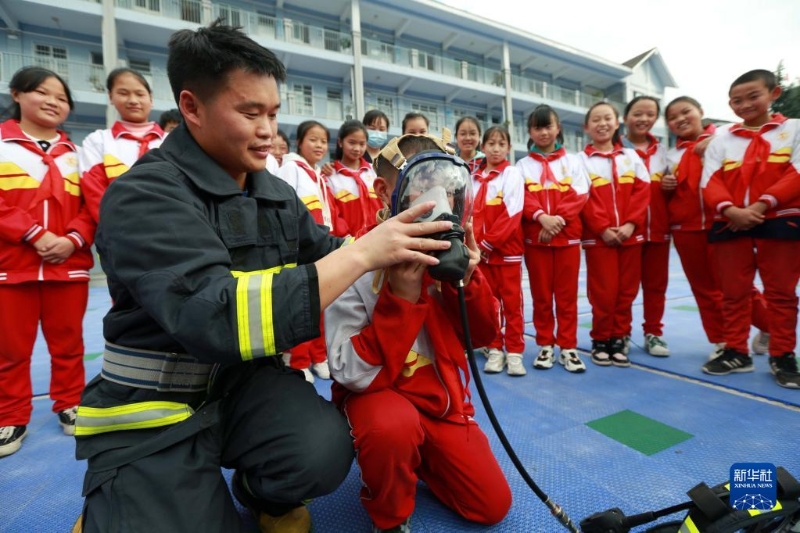 11月9日,在貴州甕安六小,學(xué)生在消防員的指導(dǎo)下體驗(yàn)佩戴防毒面罩。