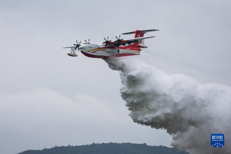 AG600M全狀態(tài)新構(gòu)型滅火機(jī)在第十四屆中國(guó)航展上進(jìn)行投水演示(11月8日攝)。新華社記者 劉大偉 攝