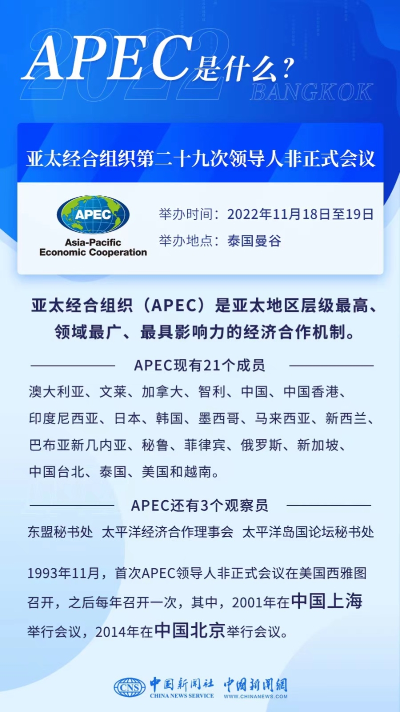 第二場的多邊會議是于11月18日至19日在泰國曼谷舉行的亞太經(jīng)合組織第二十九次領(lǐng)導人非正式會議,主題為“開放、聯(lián)通、均衡”。這是三年來APEC第一次在線下召開會議,21個經(jīng)濟體的領(lǐng)導人將迎來三年來首次重新聚首。