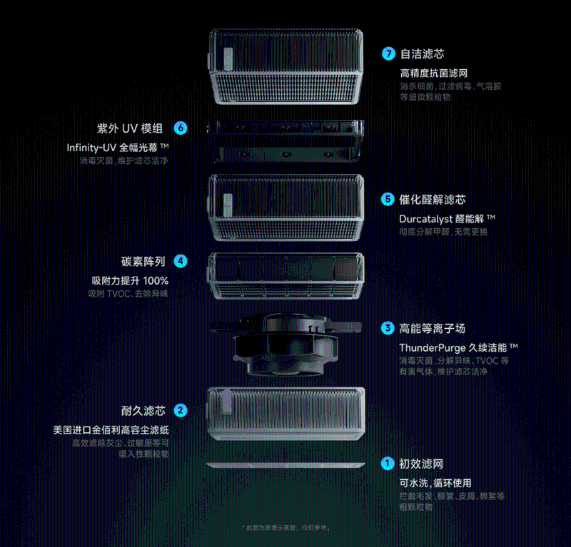 除此之外,采用7KG重的超級濾芯,七重復(fù)合凈化,從下到上,空氣依次通過可水洗循環(huán)利用的初效濾網(wǎng)、采用進口金佰利高容塵濾紙的耐久濾芯、久續(xù)潔能的高能等離子場、吸附力提升100%的萬級碳素陣列、無需更換的催化醛解濾芯、紫外UV模組的全幅光幕、高精度抗菌濾網(wǎng)的自潔濾芯,經(jīng)過層層凈化,多種空氣污染一舉拿下。