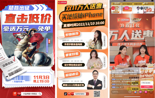 大自然家居將雙11活動(dòng)提前至10月,形成“錯(cuò)峰引流”態(tài)勢,以抖音+微信+天貓/京東作為營銷傳播主戰(zhàn)場,以節(jié)奏強(qiáng)勁的打法推出“圖文+視頻+軟文+直播”等營銷組合拳,以場景化的營銷模式,最大程度地吸引用戶的關(guān)注。