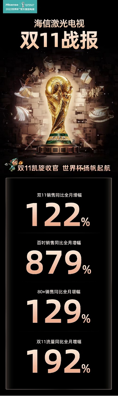 今日,海信激光電視公布今年雙十一戰(zhàn)報(bào):雙十一期間,海信激光電視銷售同比全月增長(zhǎng)122%。其中,100英寸激光電視同比全月增幅高達(dá)879%,80+英寸激光電視銷售同比全月增幅達(dá)129%。雙十一期間,海信激光電視流量同比全月增幅192%,取得亮眼成績(jī)。