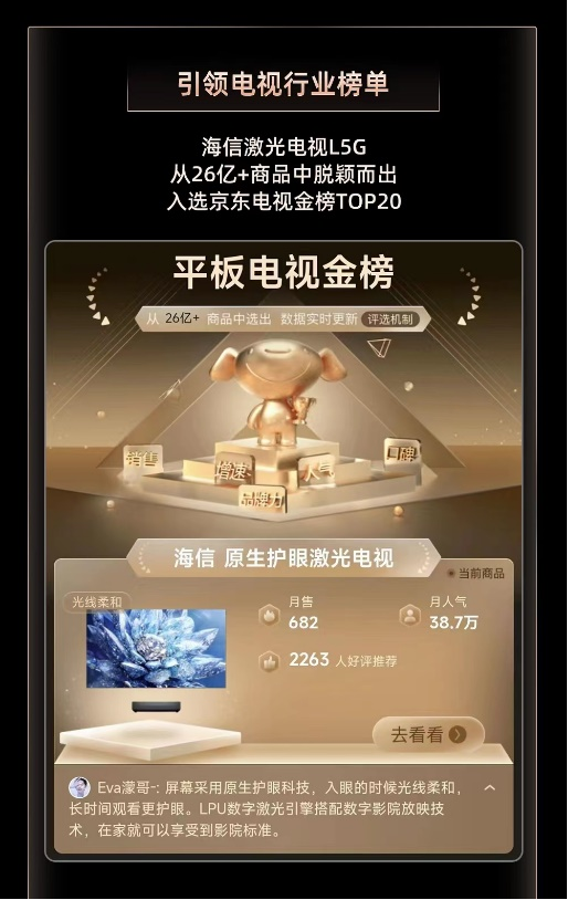 同樣值得注意的是,海信激光電視L5G還榮登京東平板電視金榜。京東金榜是以京東大數(shù)據(jù)為基礎(chǔ),結(jié)合銷售、增速、口碑、品牌、熱度等5大維度、數(shù)十項(xiàng)數(shù)據(jù)指標(biāo)評(píng)選出的行業(yè)頂尖產(chǎn)品,旨在為消費(fèi)者指明未來(lái)消費(fèi)趨勢(shì)和潮流走向,為消費(fèi)者提供消費(fèi)參考。其中,消費(fèi)者對(duì)品牌的認(rèn)同以及產(chǎn)品口碑,成為登錄京東金榜的關(guān)鍵。