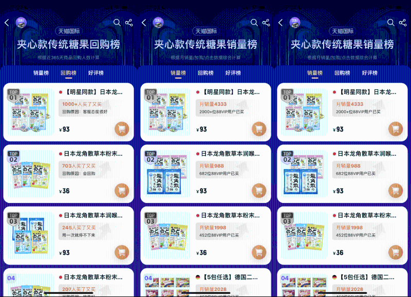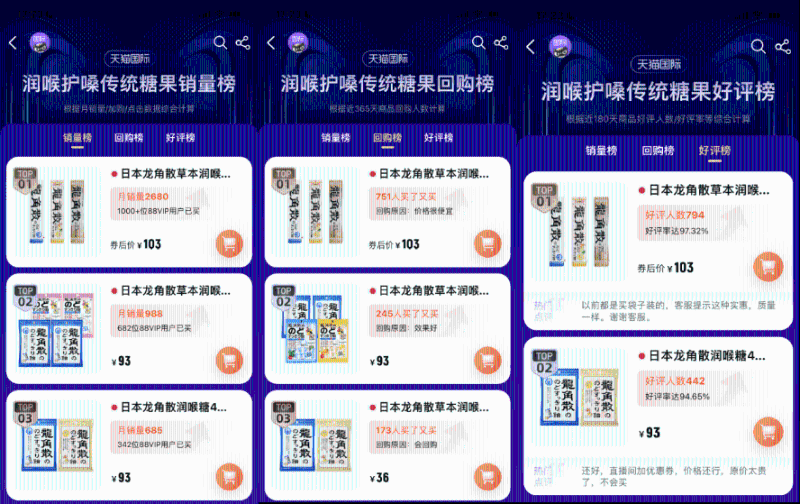 除經(jīng)典原味草本潤喉糖產(chǎn)品廣受歡迎外,龍角散草本粉末夾心潤喉糖同樣深受消費(fèi)者的喜愛——天貓平臺(tái)銷售數(shù)據(jù)顯示,在天貓夾心款傳統(tǒng)糖果好評(píng)榜、銷售榜與回購榜中該系列產(chǎn)品均位居首位。