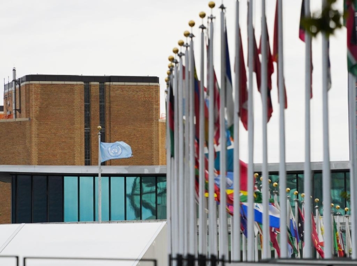 這是2020年9月14日在聯(lián)合國(guó)總部拍攝的聯(lián)合國(guó)旗和會(huì)員國(guó)國(guó)旗。新華社記者 王迎攝