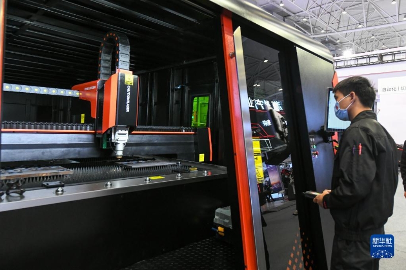 11月16日,在第十屆中國(綿陽)科技城國際科技博覽會上,參展商在示范操作特高功率激光切割機。