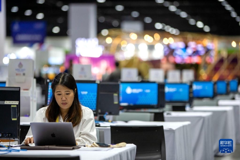 11月14日,在泰國(guó)首都曼谷,工作人員在A(yíng)PEC會(huì)議媒體中心工作。