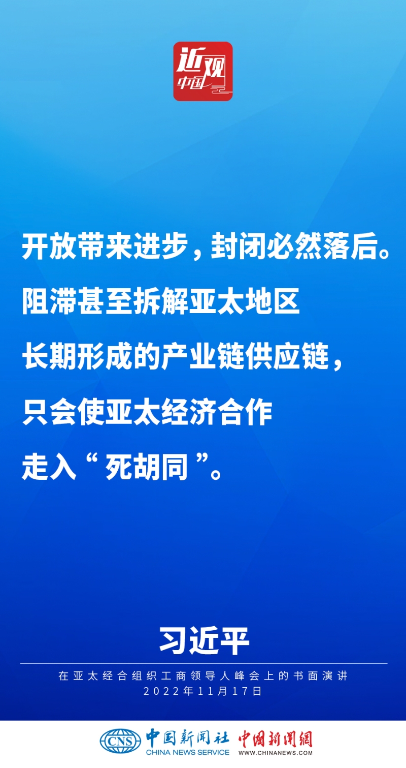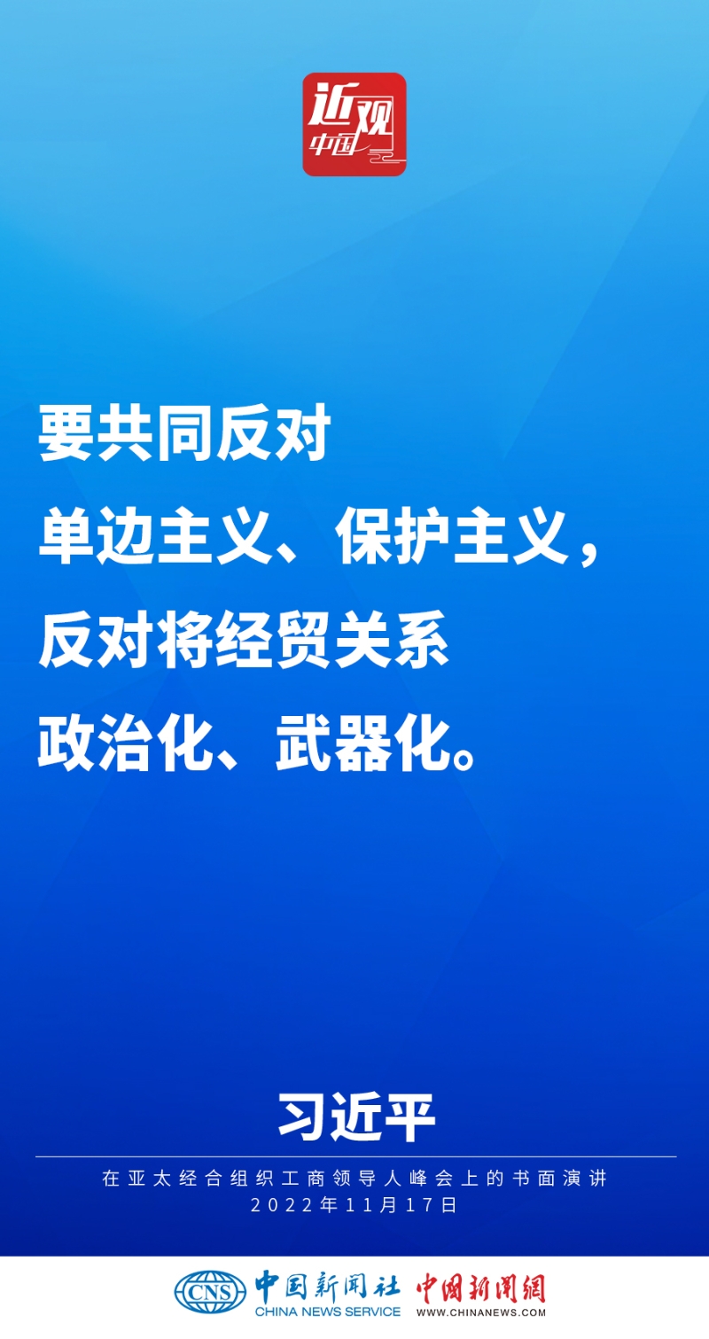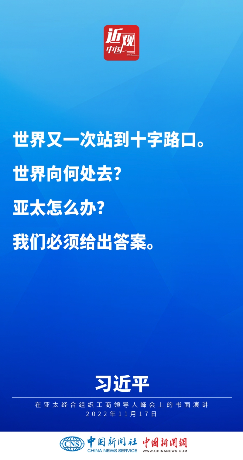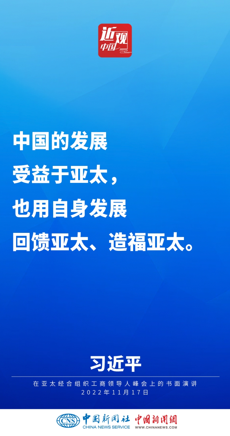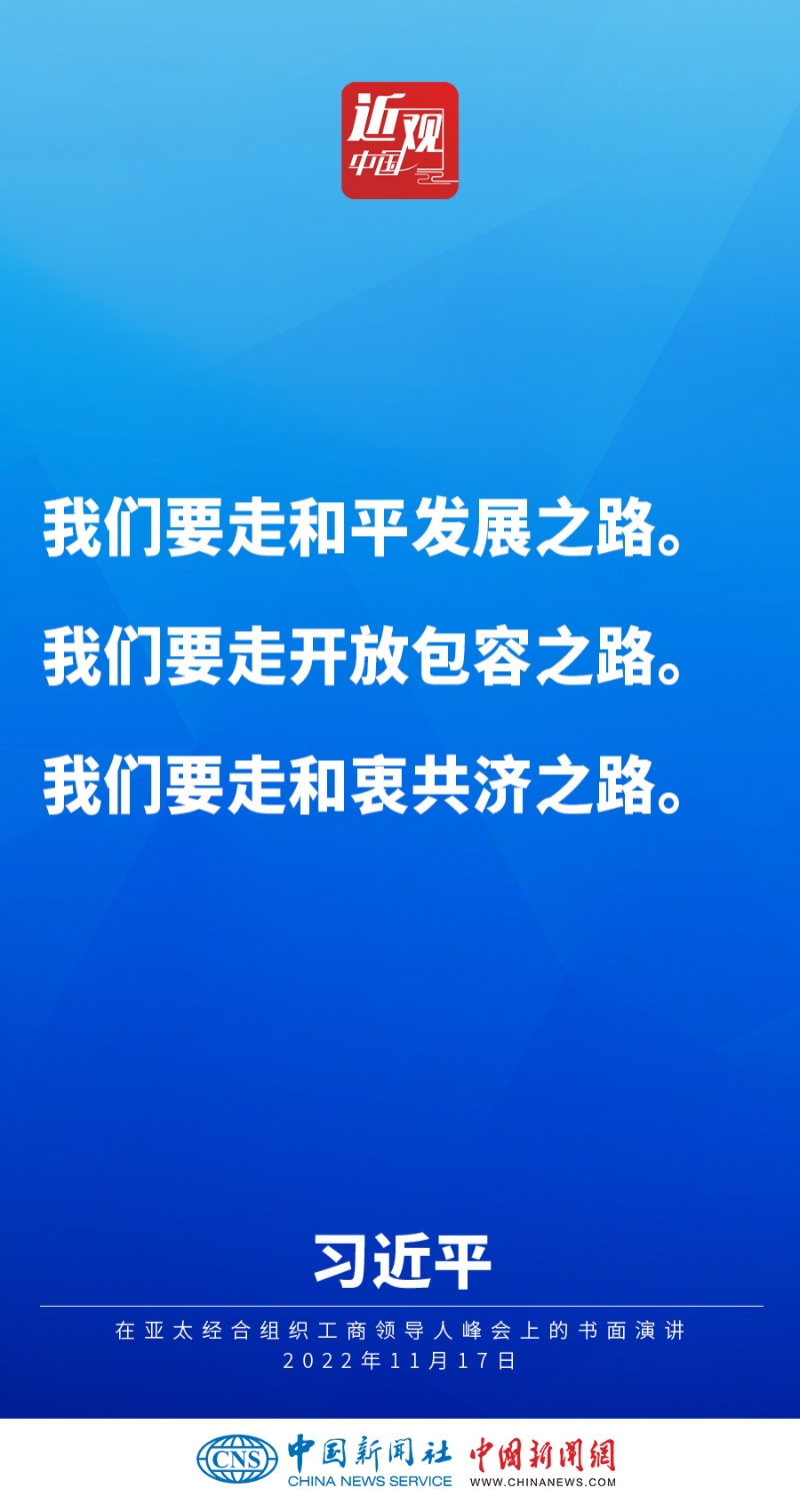 2022年11月17日,中國國家主席習(xí)近平在亞太經(jīng)合組織工商領(lǐng)導(dǎo)人峰會(huì)上發(fā)表題為《堅(jiān)守初心 共促發(fā)展 開啟亞太合作新篇章》的書面演講,他指出——