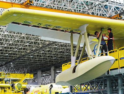 工程師在珠海中航通飛華南飛機(jī)工業(yè)有限公司AG600M總裝線上進(jìn)行總裝作業(yè)。