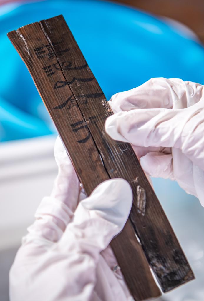 考古工作者在清理云南河泊所遺址出土的簡(jiǎn)牘(2022年9月21日攝)。新華社記者江文耀攝