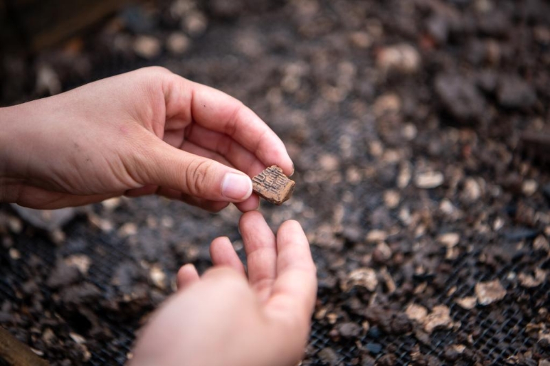 考古工作者在云南河泊所遺址現(xiàn)場(chǎng)檢查出土的封泥(2022年9月21日攝)。新華社記者江文耀攝