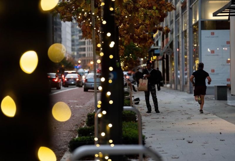 2022年11月4日,在美國首都華盛頓,行人走在一處商業(yè)街區(qū)。(新華社記者劉杰攝)