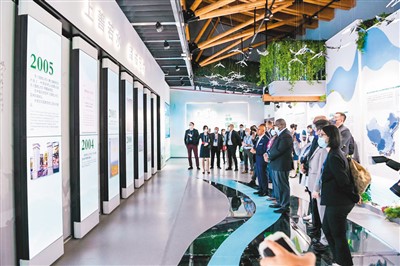 日前,在武漢參加《濕地公約》第十四屆締約方大會的中外代表參觀中國履行《濕地公約》30周年成就展。
