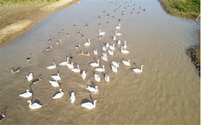 圖為11月在湖南西洞庭湖濕地拍攝的小天鵝和灰雁。