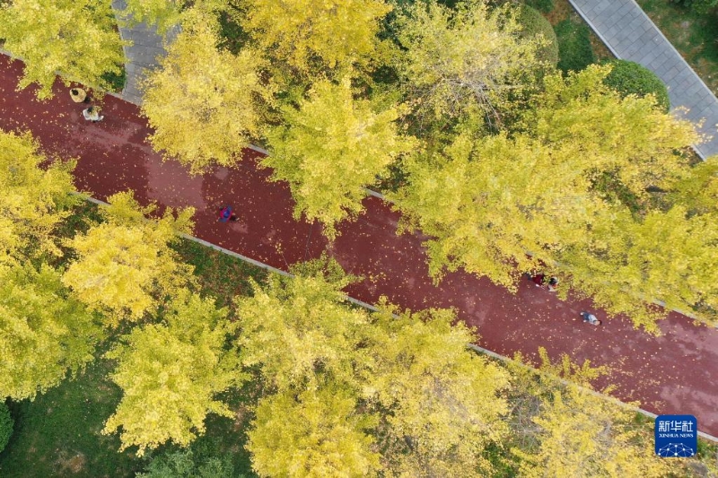 11月19日,游人在湖南省湘西土家族苗族自治州吉首市乾州街道一處銀杏林觀賞游玩(無人機照片)。