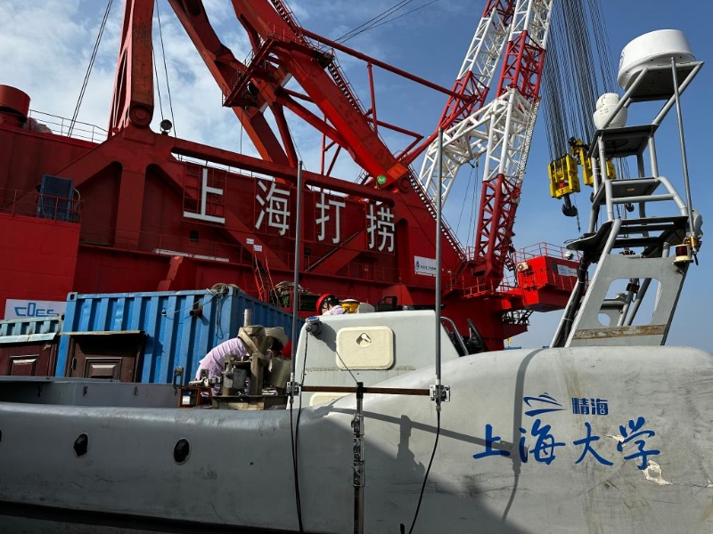 11月20日,上海大學(xué)“精?!睙o人艇參與長江口二號古船現(xiàn)場打撈作業(yè)。(受訪者供圖)