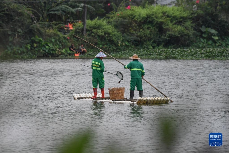 11月20日,市政園林工人在海南省屯昌縣文贊生態(tài)濕地公園清理水中垃圾。