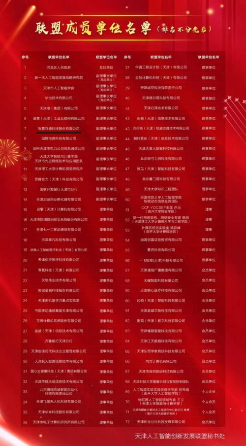 近日,天津人工智能創(chuàng)新發(fā)展聯(lián)盟首屆常務(wù)理事會(huì)成功召開,標(biāo)志著創(chuàng)新發(fā)展聯(lián)盟正式成立。聯(lián)盟首批招募成員單位72家,其中,智慧互通科技股份有限公司單位擔(dān)任副理事長單位。