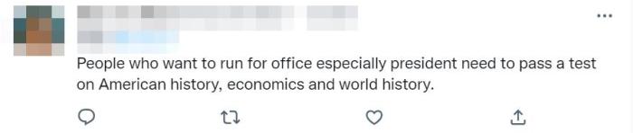 還有人吐槽,“想競選公職,尤其是總統(tǒng)的人需要通過美國歷史、經(jīng)濟和世界歷史的測試?!?/p>