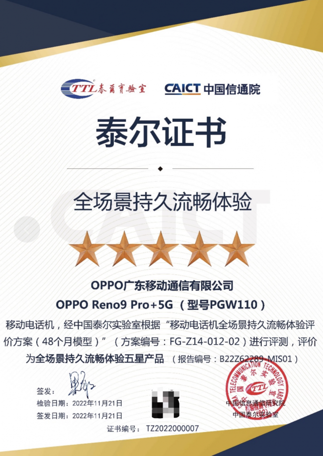 OPPO Reno9 Pro+獲得泰爾實驗室全場景持久流暢五星證書