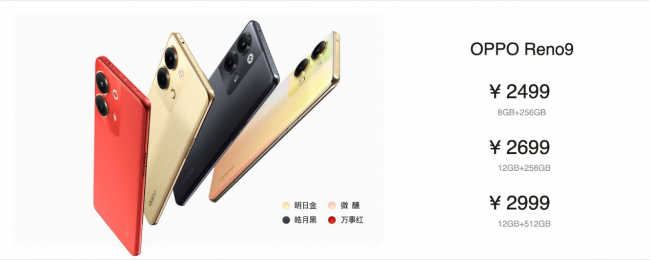 OPPO Reno9系列提供Reno9 Pro+、Reno9 Pro與Reno9三個版本。OPPO Reno9 Pro+提供明日金、皓月黑、碧海青三種配色,16GB+256GB版本售價3999元,16GB+512GB版本售價4399元;OPPO Reno9 Pro提供明日金、皓月黑、微醺三種配色,16GB+256GB版本售價3499元,16GB+512GB版本售價3799元;OPPO Reno9同樣提供明日金、皓月黑、微醺三種配色,8GB+256GB版本售價2499元,12GB+256GB版本售價2699元,12GB+512GB版本售價2999元。