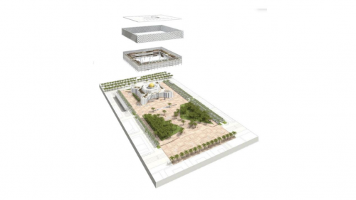 該項(xiàng)目在進(jìn)行國際招標(biāo)時(shí),沙特皇室提出在原圖書館旁的空地建設(shè)一座新圖書館。蓋博打破常規(guī),大膽地對(duì)任務(wù)書的要求做出修改建議,提出在原有的圖書館外圍擴(kuò)建的方案,而把預(yù)留的建設(shè)用地以綠洲廣場的形式還給城市,還給市民。這個(gè)顛覆性的設(shè)計(jì)概念令甲方耳目一新,大為贊嘆,在缺水缺綠化的沙特獲得熱烈反響。