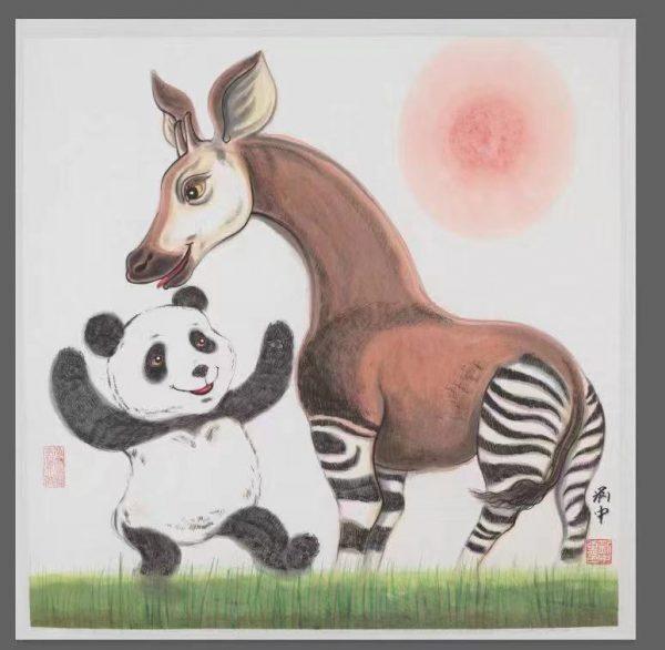 在此次50周年紀念活動中,主辦方邀請了現(xiàn)任中國美術(shù)家協(xié)會理事,“中國畫熊貓第一人”劉中老師,創(chuàng)作了《熊貓與霍加狓》。畫面中我國國寶大熊貓攜手憨態(tài)可掬的剛果(金)國寶霍加狓,寓意中剛和平友好,友誼長存。