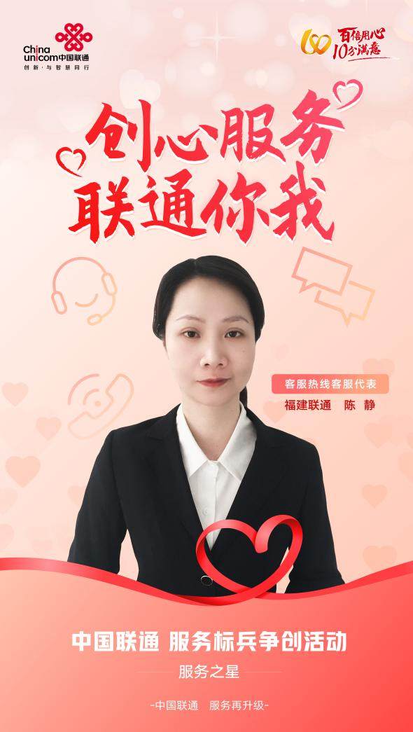 福建聯(lián)通客服熱線的客服代表陳靜,從事客服工作十多年,始終以“客戶為本、服務(wù)為上”為宗旨,一方面通過投申案件及時發(fā)現(xiàn)問題,推動專業(yè)部門落實整改;另一方面努力提升員工服務(wù)質(zhì)量,快速解決客戶“急難愁盼”問題。她用有力度、有深度、有溫度的優(yōu)質(zhì)服務(wù),獲得了眾多用戶的高度贊揚和認可。