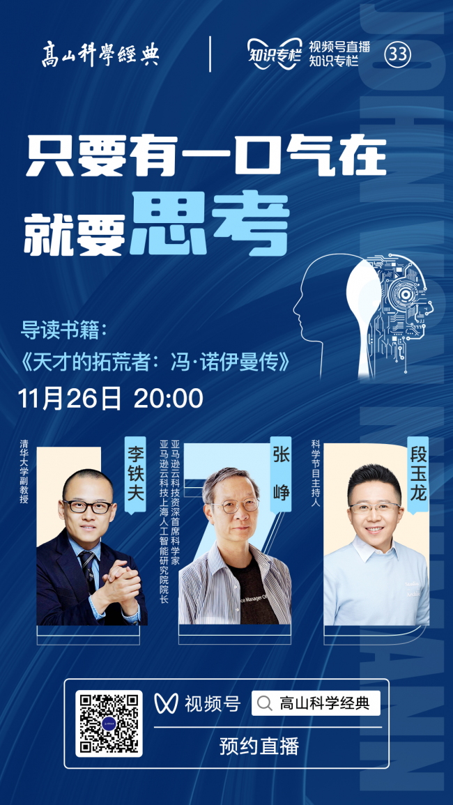 2022年11月26日晚八點,科普公益項目“高山科學(xué)經(jīng)典”邀請到了亞馬遜云科技資深首席科學(xué)家,亞馬遜云科技上海人工智能研究院院長張崢;清華大學(xué)副教授李鐵夫;科學(xué)節(jié)目主持人段玉龍,一起閱讀《天才的拓荒者:馮·諾伊曼傳》