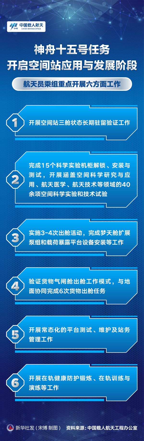 季啟明說,神舟十五號航天員乘組將重點(diǎn)開展6個方面工作:一是開展空間站三艙狀態(tài)長期駐留驗(yàn)證工作;二是完成15個科學(xué)實(shí)驗(yàn)機(jī)柜解鎖、安裝與測試,開展涵蓋空間科學(xué)研究與應(yīng)用、航天醫(yī)學(xué)、航天技術(shù)等領(lǐng)域的40余項(xiàng)空間科學(xué)實(shí)驗(yàn)和技術(shù)試驗(yàn);三是實(shí)施3-4次出艙活動,完成夢天艙擴(kuò)展泵組和載荷暴露平臺設(shè)備安裝等工作;四是驗(yàn)證貨物氣閘艙出艙工作模式,與地面協(xié)同完成6次貨物出艙任務(wù);五是開展常態(tài)化的平臺測試、維護(hù)及站務(wù)管理工作;六是開展在軌健康防護(hù)鍛煉、在軌訓(xùn)練與演練等工作。