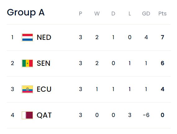 最終,荷蘭隊積7分排名本組第一,橙衣軍團將在八分之一決賽中對陣B組第二名。塞內(nèi)加爾積6分排名次席,他們在八分之一決賽中對手是B組頭名。積4分的厄瓜多爾在最后時刻失去了出線資格,而東道主卡塔爾遭遇三連敗,但打入了隊史世界杯首粒進球。