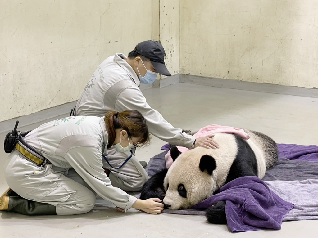 大熊貓“團(tuán)團(tuán)”19日在下午1時48分心跳停止,在臺14年歲月正式落幕。圖為工作人員陪伴團(tuán)團(tuán)。(圖/ 中時電子報系資料照)