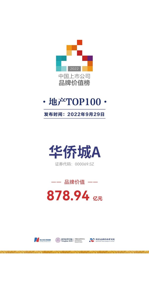 華僑城A以品牌價(jià)值878.94億元,位列“2022中國(guó)地產(chǎn)上市公司品牌價(jià)值榜TOP100”第6位