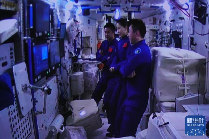 11月30日在酒泉衛(wèi)星發(fā)射中心拍攝的神舟十四號航天員劉洋、蔡旭哲在問天實驗艙迎接神舟十五號航天員乘組的畫面。新華社記者 郭中正 攝