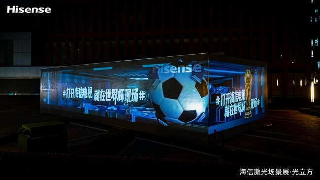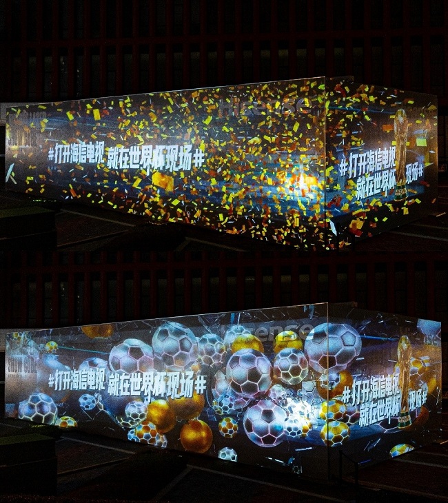 在“光立方”的外立面,海信精心打造了世界杯主題裸眼3D光影秀,霸屏光立方128㎡巨幕。通過借助3D技術和數(shù)字藝術,光影秀以逼真的色彩和具有沖擊力的視覺效果,展現(xiàn)足球、藝術、科技三者交融的強大魅力,為觀眾帶來震撼的視覺體驗。