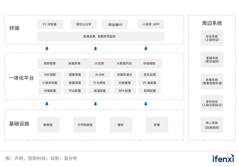 音視頻中臺往往采用分層解耦架構(gòu)設(shè)計,整體共分為三層:底層是原子化的音視頻技術(shù),針對各場景通用的能力要求提供音視頻引擎;中間層是對反復(fù)應(yīng)用的功能或規(guī)則,形成多個標(biāo)準(zhǔn)化的功能模塊和服務(wù)組件;最上層是接入層,涵蓋面向保司的各類信息系統(tǒng)和面向客戶的多種渠道。除此之外,音視頻中臺還在中間層增添了一定的AI能力,提升音視頻中臺的智能化程度。
