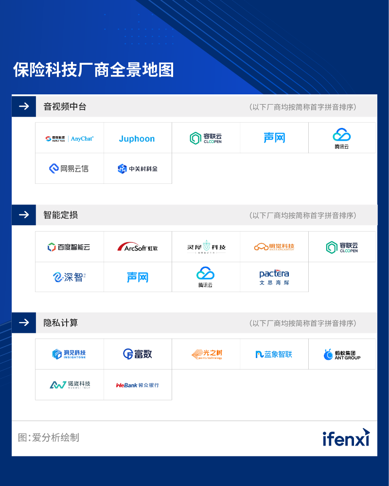 本次報告,愛分析將保險科技市場分為“基礎(chǔ)設(shè)施”“支撐平臺”“前端應(yīng)用”三層。其中,“基礎(chǔ)設(shè)施”主要指云基礎(chǔ)設(shè)施、云原生、智能運維、數(shù)據(jù)庫等底層能力;“支撐平臺”包含AI中臺、音視頻中臺、數(shù)據(jù)中臺、智能客服等可以向險企多個部門提供支撐能力的系統(tǒng)或解決方案;“前端應(yīng)用”則包括直接作用在險企對外業(yè)務(wù)場景和對內(nèi)通用職能場景的系統(tǒng)或解決方案。