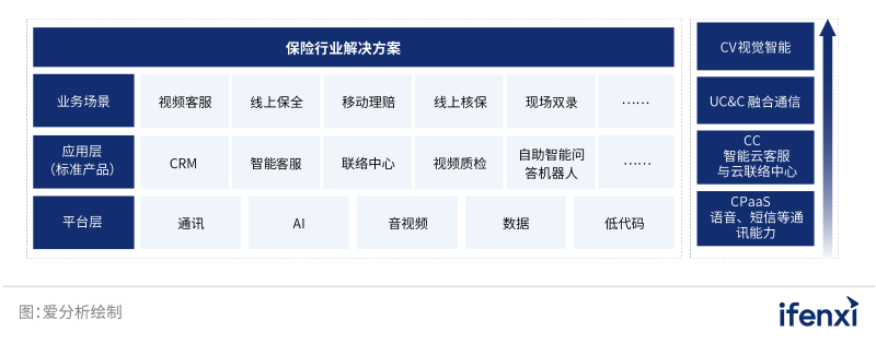 具有豐富的產(chǎn)品矩陣,為保險行業(yè)打造垂直解決方案。一方面,容聯(lián)云進行了CPaaS+ CC+ UC&C+CV的全產(chǎn)品線布局,從底層基礎(chǔ)能力到服務(wù)層至應(yīng)用層實現(xiàn)全面覆蓋;另一方面,容聯(lián)云針對保險行業(yè)的業(yè)務(wù)場景和要求,提供完整的行業(yè)解決方案,在平臺層提供通訊、AI、音視頻、數(shù)據(jù)、低代碼等5大平臺能力;在應(yīng)用層提供CRM、智能客服、聯(lián)絡(luò)中心、自助智能問答機器人、視頻質(zhì)檢、CPaaS音視頻中臺等標準產(chǎn)品;支持包括視頻客服、線上保全、移動理賠、線上核保、現(xiàn)場雙錄等多種業(yè)務(wù)場景。