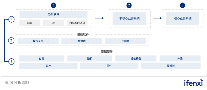 近年來,受中美貿(mào)易戰(zhàn)、科技戰(zhàn)等內(nèi)外部多重因素影響,進(jìn)行信息技術(shù)應(yīng)用創(chuàng)新(以下簡稱信創(chuàng)),打造全面自主可控的國產(chǎn)IT架構(gòu),已逐漸成為我國構(gòu)筑核心安全屏障,實現(xiàn)經(jīng)濟(jì)數(shù)字化轉(zhuǎn)型、提升產(chǎn)業(yè)鏈發(fā)展的重要戰(zhàn)略方針。在這一背景下,自2020年開始,伴隨著支持政務(wù)信息化安全可控、金融行業(yè)信息化核心技術(shù)安全可控的政策密集出臺,以黨政、金融為首全面信創(chuàng)趨勢不斷演進(jìn)。各行業(yè)逐步摸索出從基礎(chǔ)硬件、到基礎(chǔ)軟件、再到應(yīng)用軟件的縱向替換路徑,以及從OA系統(tǒng)、到非核心業(yè)務(wù)系統(tǒng)、再到核心業(yè)務(wù)系統(tǒng)的橫向路徑。