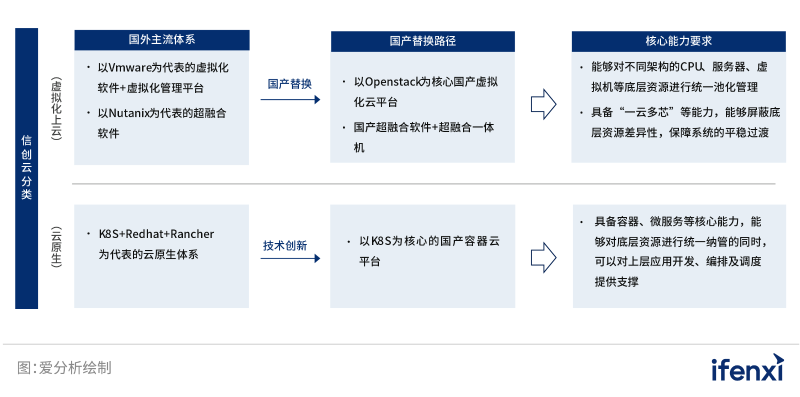 除底層基礎(chǔ)設(shè)施的國產(chǎn)化替換外,在當(dāng)今數(shù)字化轉(zhuǎn)型的浪潮下,云平臺作為企業(yè)IT核心平臺軟件,能夠向下對接IT基礎(chǔ)設(shè)施,向上承接企業(yè)應(yīng)用,有效提升底層資源利用效率。因此,云平臺的全面國產(chǎn)化,也成為了企業(yè)構(gòu)建全棧自主可控IT架構(gòu)的關(guān)鍵一環(huán)?,F(xiàn)階段,信創(chuàng)云大致可以分為三類,分別是傳統(tǒng)架構(gòu)信創(chuàng)云(虛擬化)、云原生架構(gòu)信創(chuàng)云以及超融合架構(gòu)信創(chuàng)云。