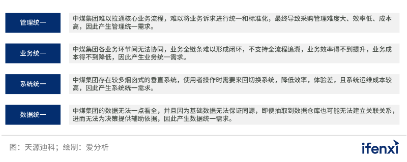 中煤集團(tuán)在發(fā)展過程中部署了多套采購數(shù)字化相關(guān)軟件系統(tǒng),包括采購商城、采購合同管理系統(tǒng)、招標(biāo)系統(tǒng)、非招標(biāo)系統(tǒng)、財(cái)務(wù)管理系統(tǒng)等。這些系統(tǒng)部署于不同時(shí)期,并且供應(yīng)商大多各不相同,系統(tǒng)之間難以互通并產(chǎn)生諸多困擾。新問題產(chǎn)生新需求,中煤集團(tuán)對(duì)于采購數(shù)字化的新需求可以總結(jié)為“四大統(tǒng)一”:管理統(tǒng)一、業(yè)務(wù)統(tǒng)一、系統(tǒng)統(tǒng)一和數(shù)據(jù)統(tǒng)一。