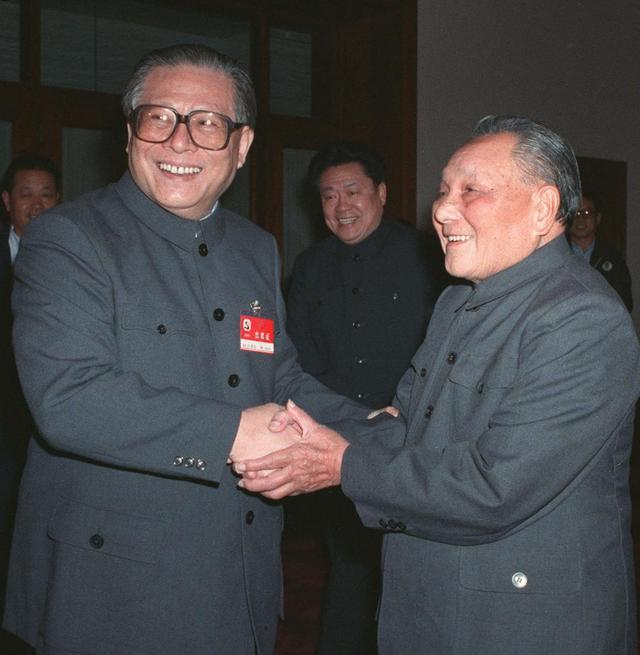 1989年11月6日至9日,中國(guó)共產(chǎn)黨第十三屆中央委員會(huì)第五次全體會(huì)議在北京召開(kāi)。這是鄧小平同志和江澤民同志親切握手。新華社發(fā)