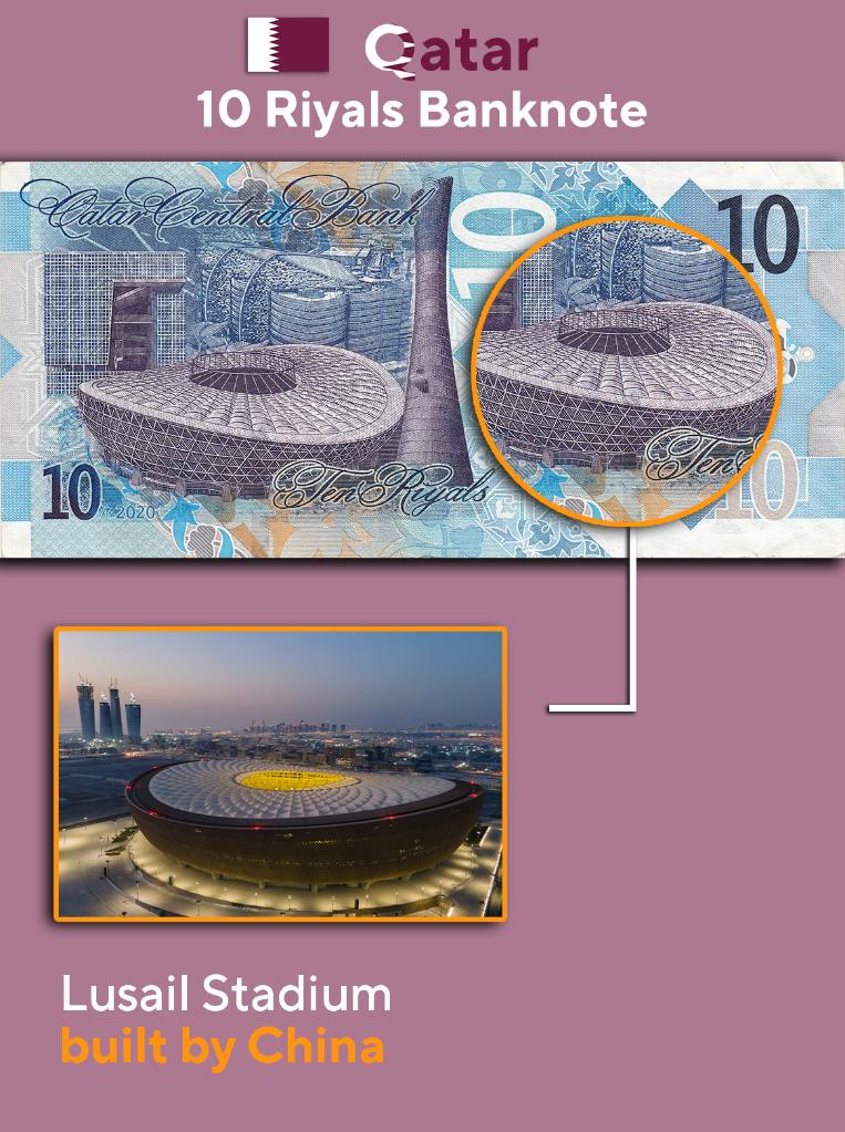 ↑卡塔爾面額10里亞爾紙幣——盧賽爾球場